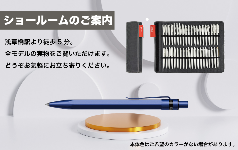 Prodirボールペンのサンプルは、東京・浅草橋駅近くにある本社のショールームにて全モデルを取り揃えており、どなたでもご自由にご覧いただけます。